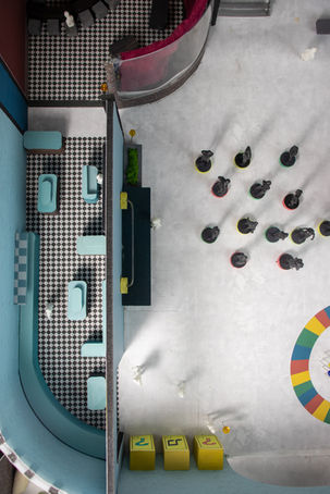 This retro-inspired zone is made for movement and fun. Unlike other spaces, it encourages guests to explore, play, and interact. Features include a couched ball pit, mega console game, swing set, photo arch, Light Tap game, 5-player air hockey, and more.