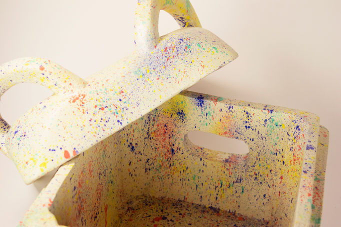The ottoman begins as a single-piece form made through rotational molding using a three-part mold.
